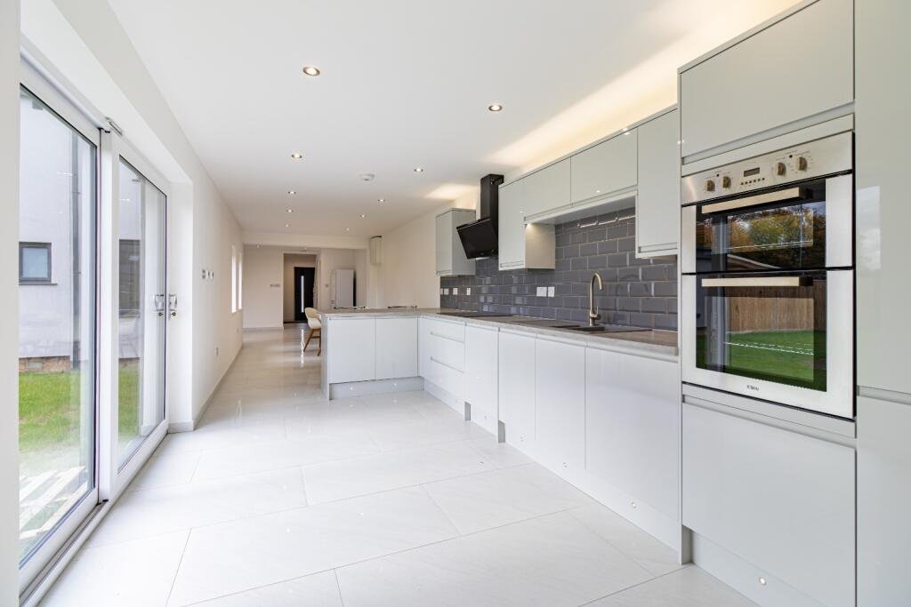 The ground floor features an impressive open-plan kitchen and dining space, fitted with a range of integrated appliances and opening directly to the south-facing rear garden. There is also a practical utility room, ground-floor cloakroom and underfloor heating in the tiled areas for added warmth and comfort.