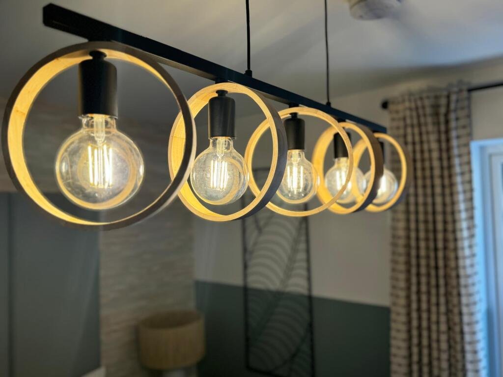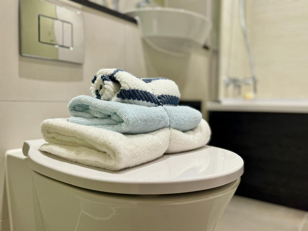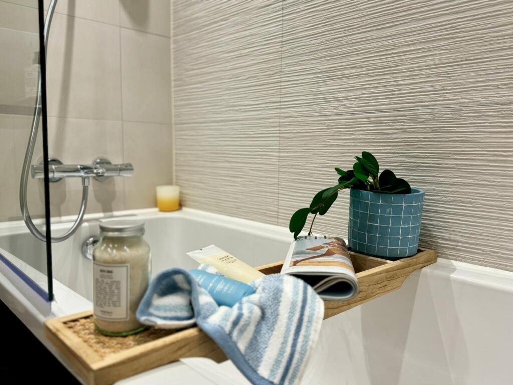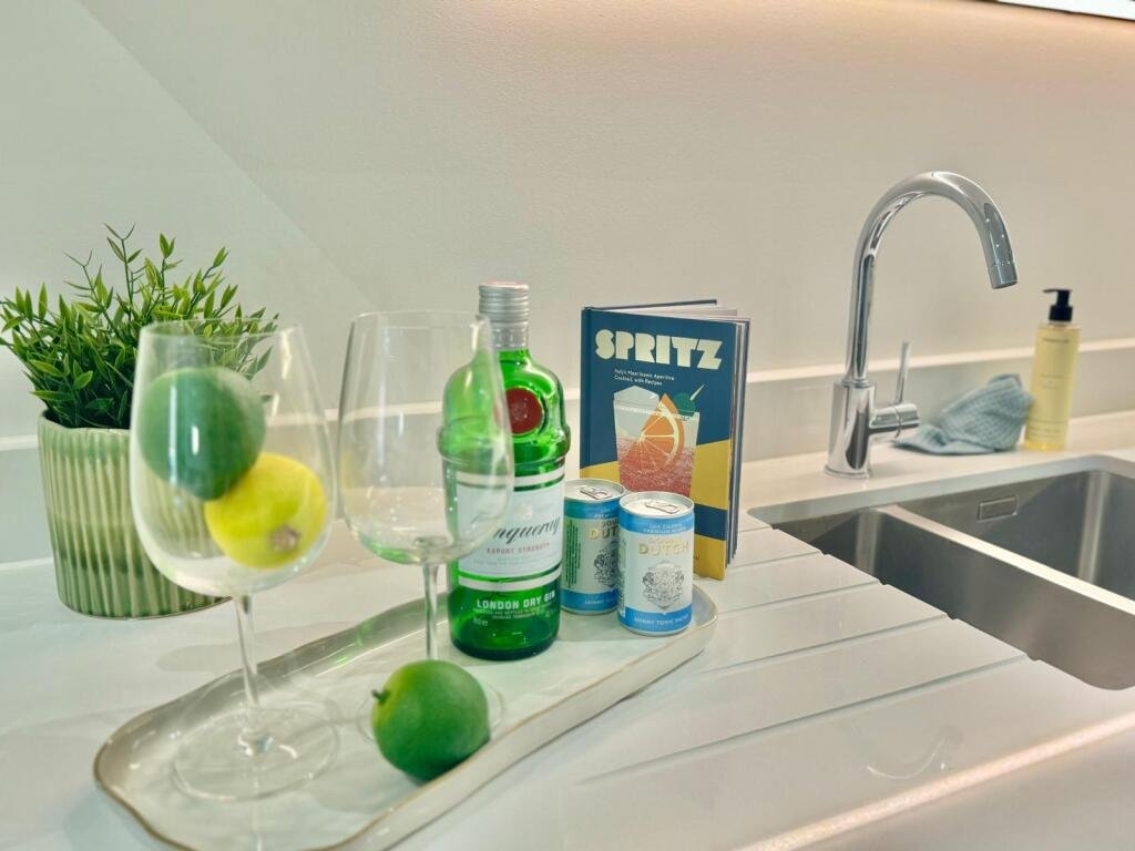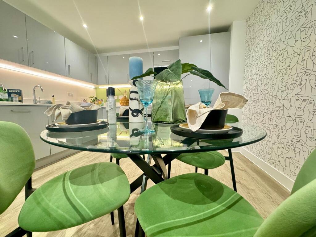 At the heart of this beautiful apartment is the open-plan kitchen and living area, designed for both relaxation and entertaining. The kitchen boasts fully integrated Bosch appliances, complemented by a chic glass dining table. The inviting living space features a plush three-seater blue sofa that perfectly matches the sophisticated wallpaper, creating a warm and welcoming ambiance.
