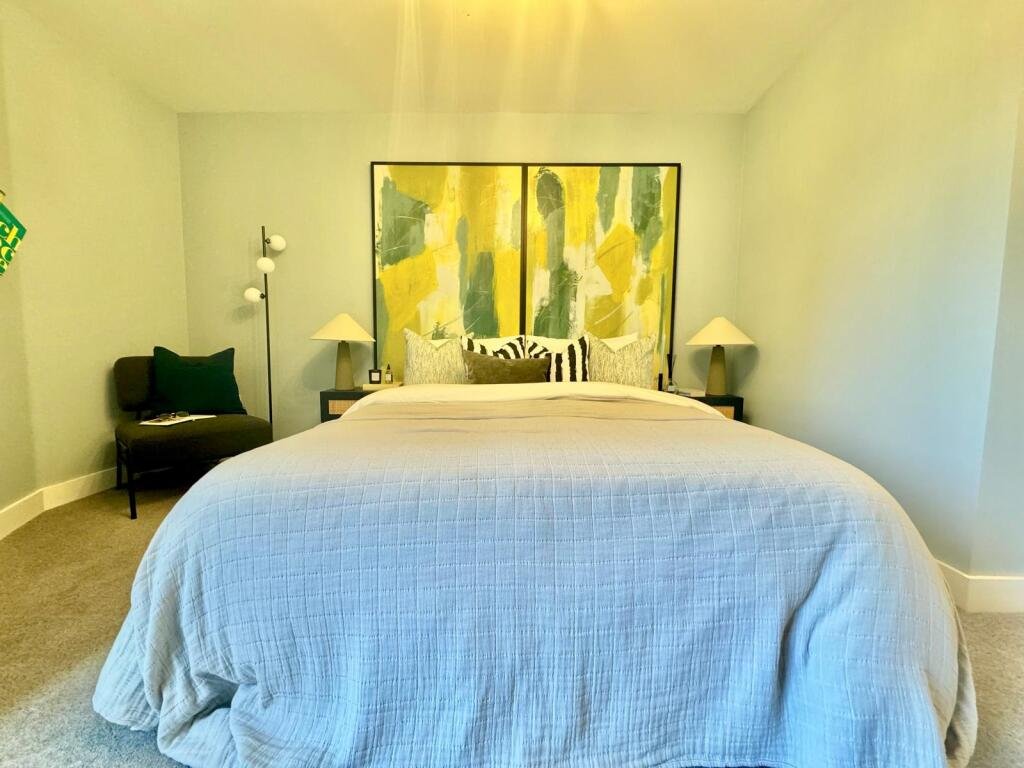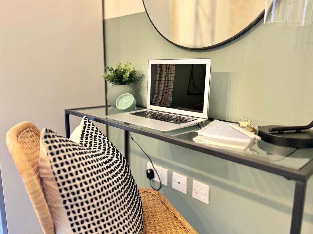 The second bedroom is equally inviting, furnished with a double bed, a free-standing wardrobe, and a stylish glass desk and chair—perfect for those who need a dedicated workspace.