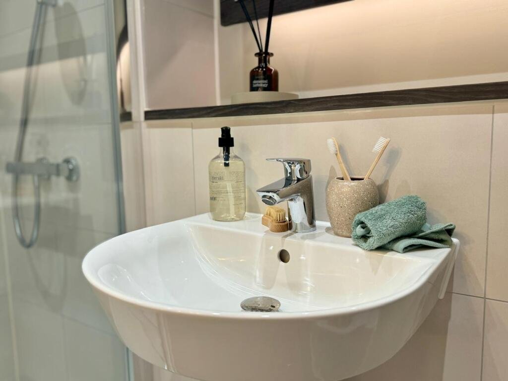 The family bathroom is a true showcase of attention to detail, featuring a sleek radiator, mixer taps, a shower over the bath, a wash hand basin, an extractor fan, and elegant tiling throughout.