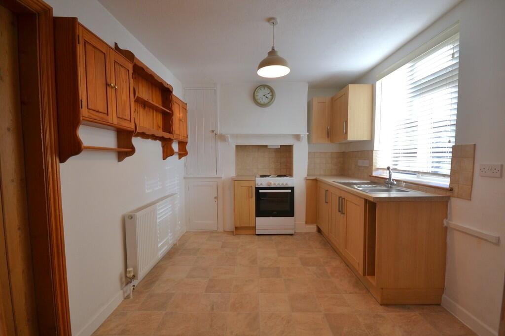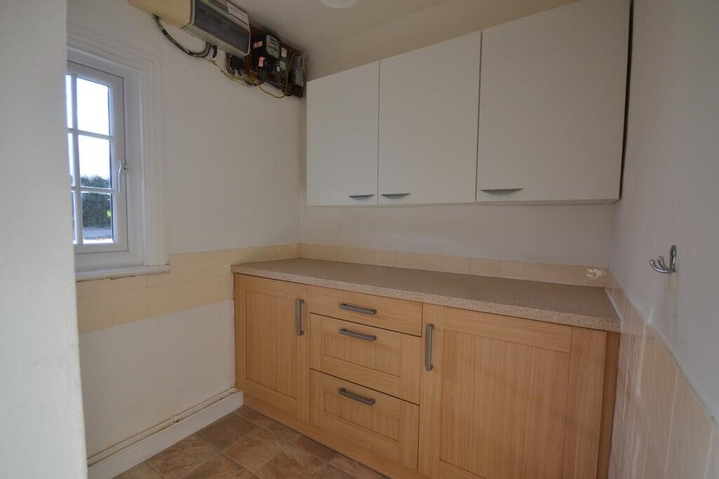 The property offers a modern kitchen with a range of wall and base units, freestanding electric cooker and space for a fridge/freezer. There is also a useful rear porch, utility room and spacious downstairs bathroom with shower over the bath, vanity unit, WC and room to house a washing machine. The living room has a window to the front aspect and in set log burning stove.