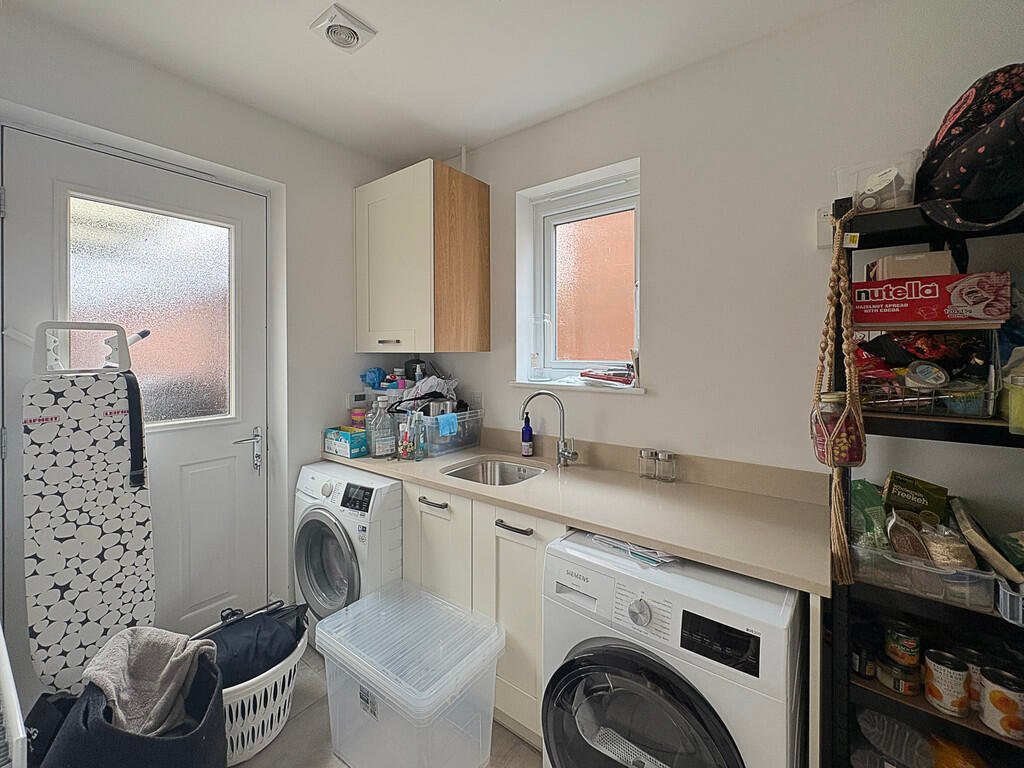 The ground floor features a bright kitchen/dining room with French doors opening to the rear garden, providing an excellent space for both everyday use and entertaining. The kitchen comes fully fitted with appliances, including a fridge/freezer and washing machine, and is complemented by a separate utility room and ground floor WC for added convenience.