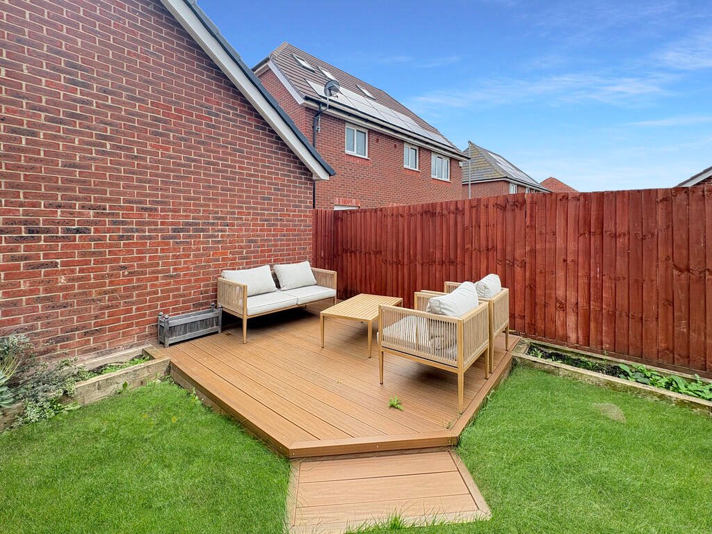 Outside, the property benefits from an enclosed rear garden with patio area, perfect for outdoor dining, and a detached garage with driveway parking.