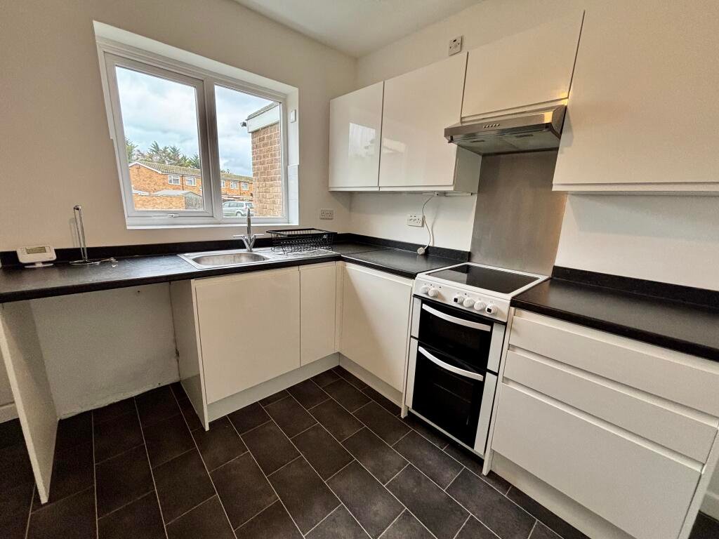 Kitchen,Modern vinyl flooring, range of eye and base level units, spaces for washing machine and fridge freezer, cooker with extractor hood over, inset stainless steel sink with drainer, door through to living room, window to front aspect.