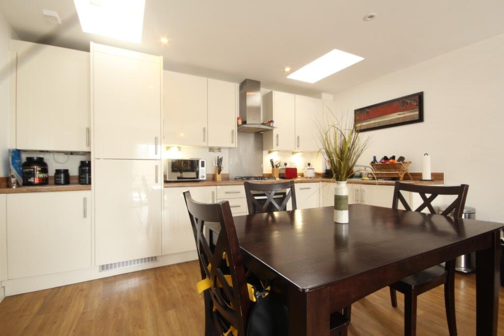 OPEN PLAN KITCHEN / LIVING / DINING AREA: 6.06m x 4.23m – Range of base and wall units, gas hob and electric oven, integrated fridge/freezer/dishwasher and washer/dryer, two windows to front, wood effect flooring.