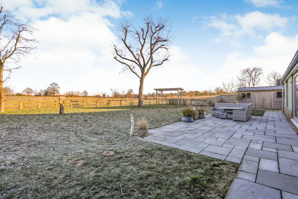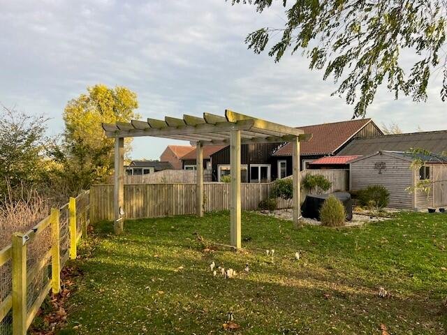Outside, the property enjoys a wrap-around garden with a large patio and pergola area, perfect for entertaining or relaxing. The double cart-lodge, complete with solar panels, and shingle driveway provide ample parking and storage.