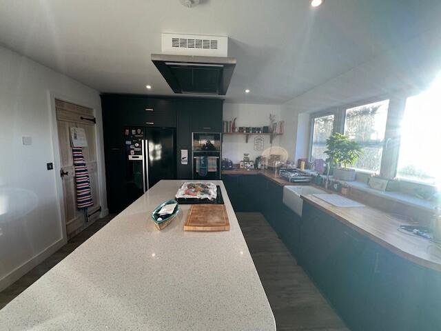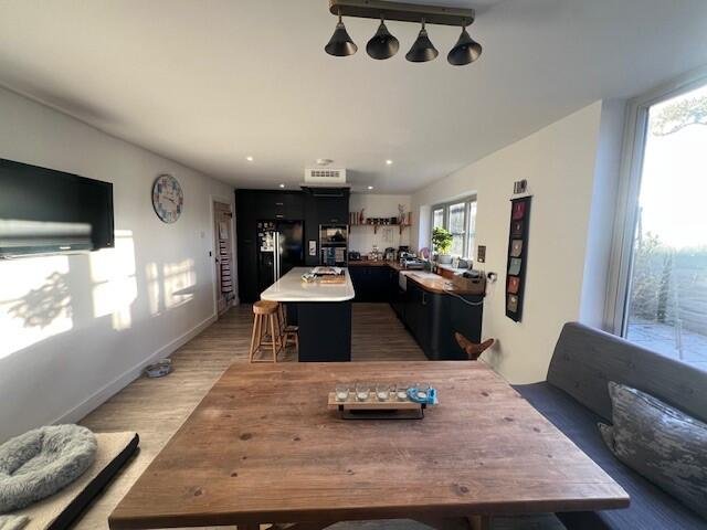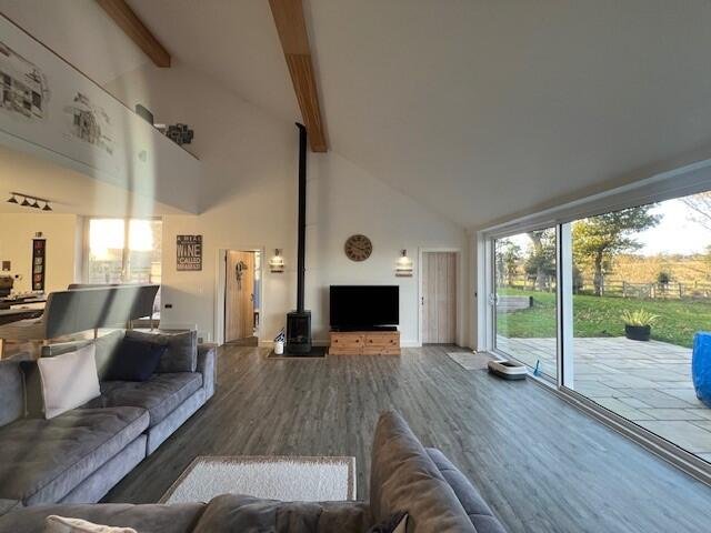 On entering, you are greeted by a generous hallway leading to a stunning open-plan living space with vaulted ceiling and feature log-burner. Expansive glazing and patio doors flood the room with natural light and open out to the private garden and terrace.