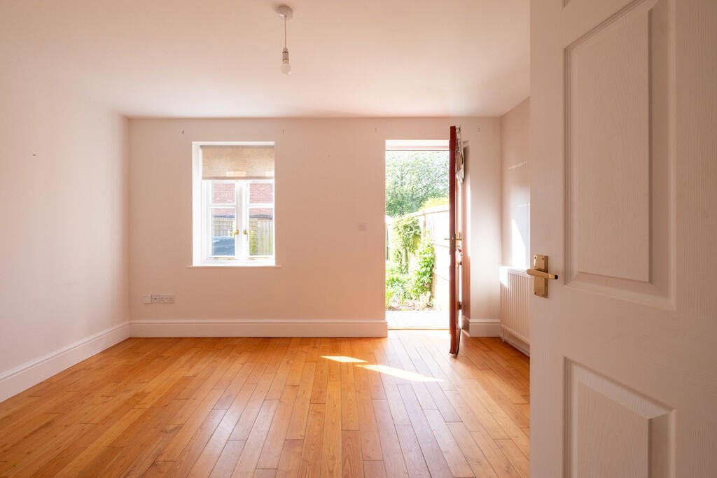 Moving towards the rear, a generously proportioned living room awaits, bathed in natural light pouring in through large south-facing windows and doors, offering enchanting views of the garden beyond. Chestnut flooring unifies the ground floor, infusing warmth and character into the living spaces.