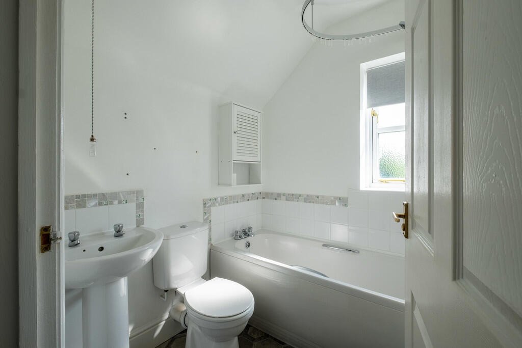 Completing the ground floor amenities, a convenient cloakroom adds to the functional layout. Ascending the stairs, a central landing guides you to the rear-facing bedroom, offering tranquil village vistas. The modern bathroom features pristine white sanitaryware, with a panel bath and shower overhead, providing a sanctuary for relaxation. A storage room ensures effortless organization of your belongings.