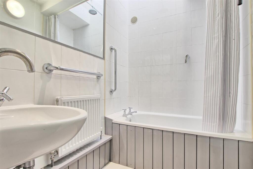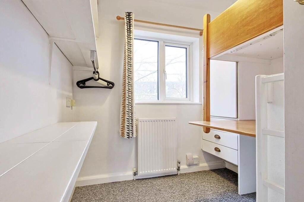 On the first floor, there are four bedrooms, all carpeted and finished in neutral décor. Bedroom three is the first room you reach at the top of the stairs, overlooking the rear garden. Bedroom one, positioned next to bedroom three, also overlooks the rear of the property and is a generous double. Bedroom two, is facing the front, is another double with a large window, flooding the room with natural light. Bedroom four overlooks the front and features a bespoke raised bed with integrated shelving and workspace below—making it ideal for a child’s room, or study.