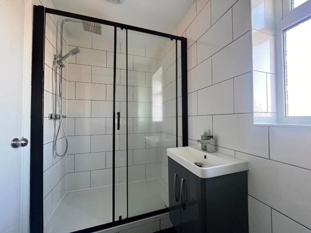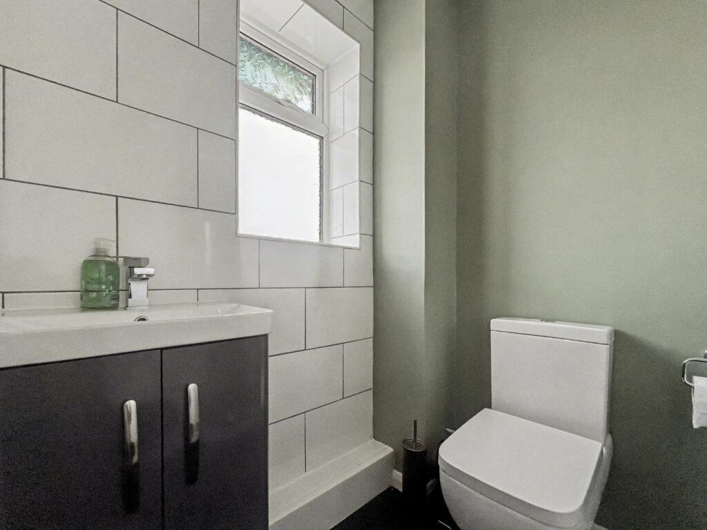 Refitted Bathroom: Window to Side: Double Walk-in Shower Curicle: Wash Hand Basin with Vanity Unit: Toilet: Heated Towel Radiator.