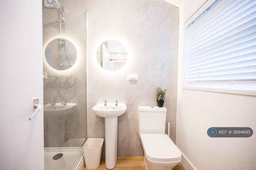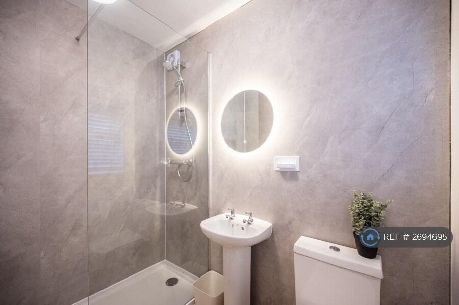 The sleek and modern shower room is newly fitted with a walk-in shower, contemporary panelling, full height towel rail, electric toothbrush charging points and LED mirror.