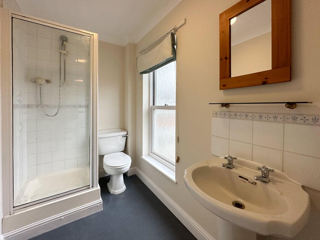 ENSUITE With vinyl flooring, window, radiator, extractor fan, toilet, sink and corner enclosure with thermostatic mixer shower. Â