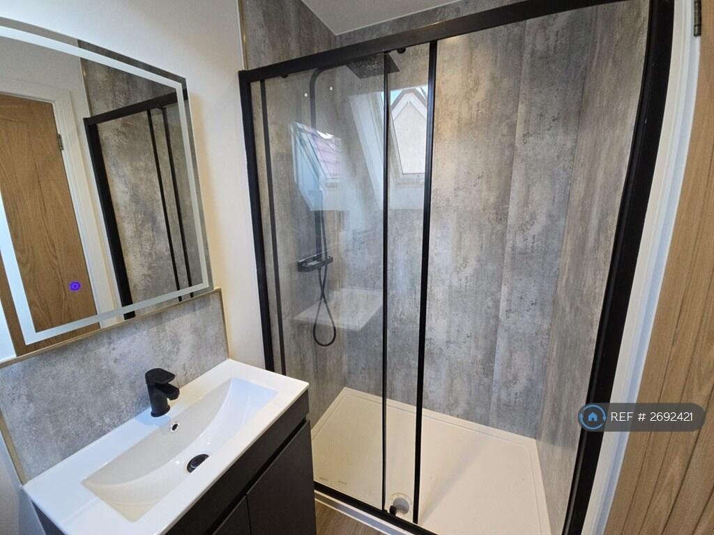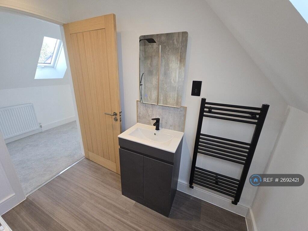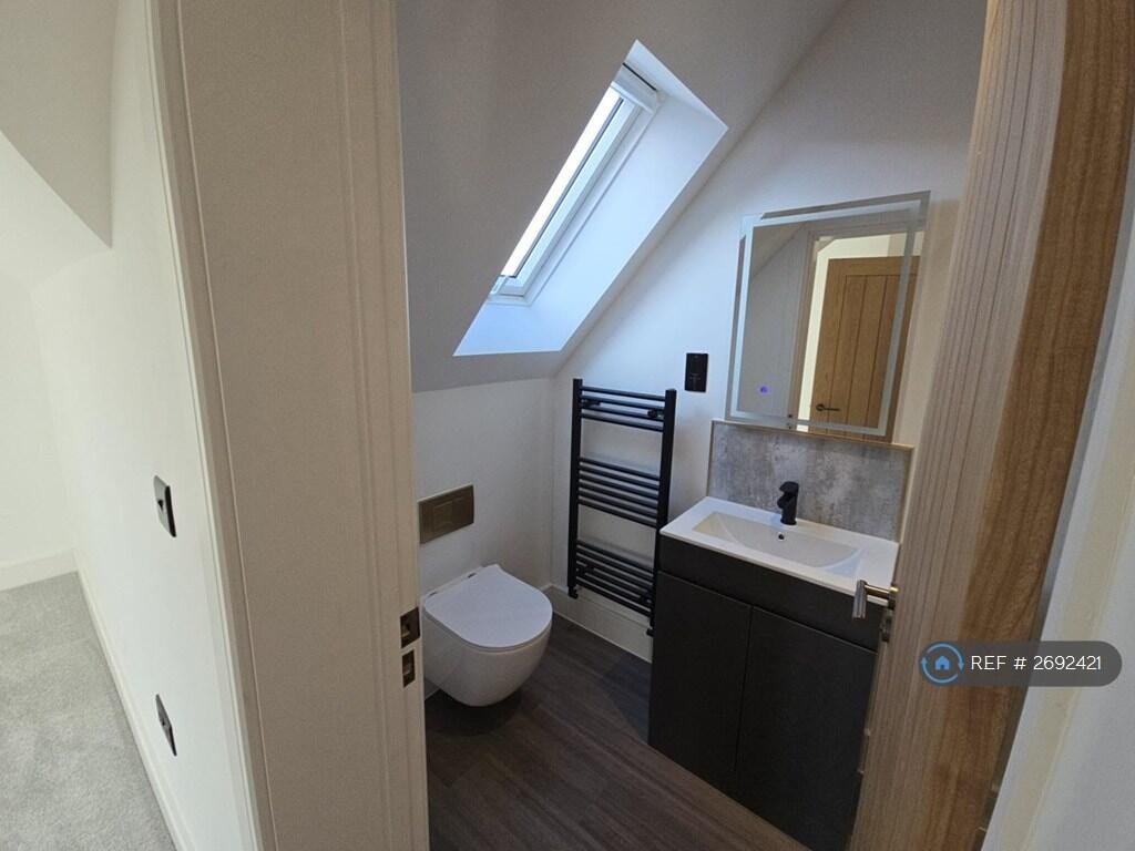 En-suite Comprising an aqua boarded shower with glazed shower screen, integrated twin head shower, vanity mounted wash hand basin with mixer tap, tiled splashback and vanity mirror above, low level WC with integrated flush, Velux window to front, inset ceiling downlighting, extractor fan, electric shaving point, wall mounted heated towel rail, wood effect luxury vinyl flooring.