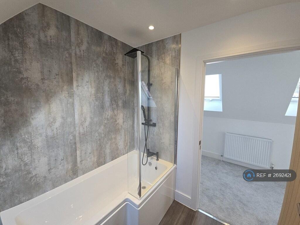Family Bathroom Comprising a three piece suite of panel enclosed bath with integrated twin head shower, aqua board shower with glazed shower screen, low level WC with integrated flush, vanity mounted wash hand basin with mixer tap and tiled splashback, vanity mirror above, Velux window to front, inset ceiling downlighting, extractor fan, electric shaving point, wall mounted heated towel rail, wood effect luxury vinyl flooring.