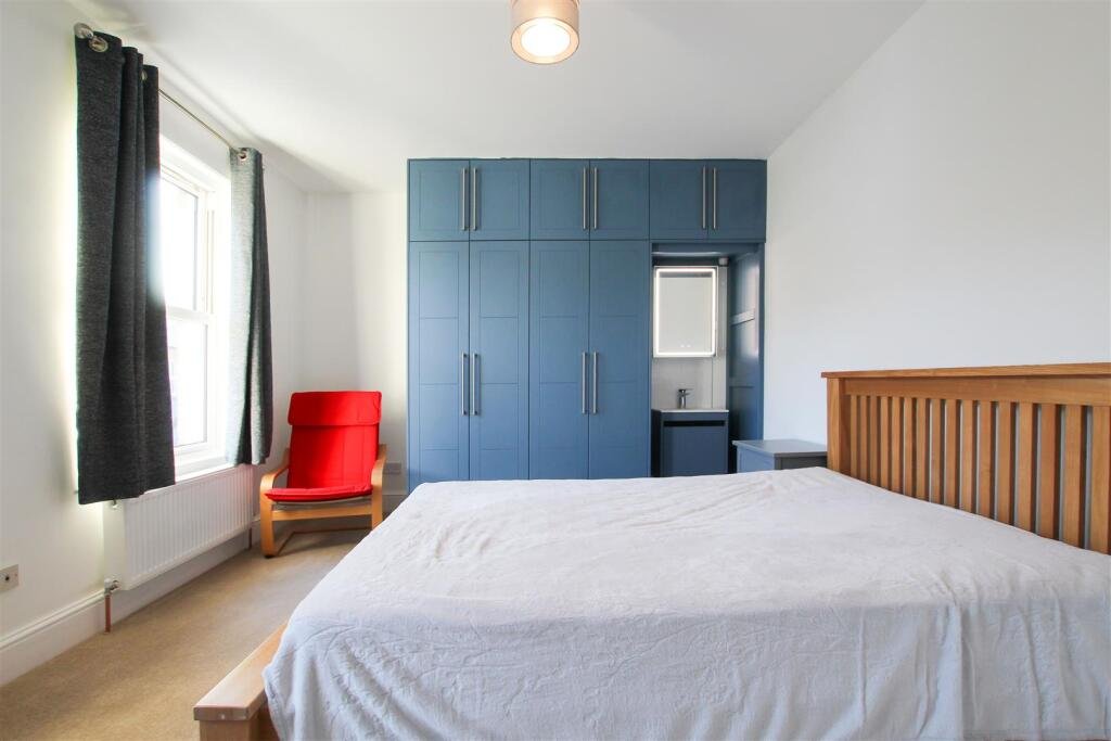 Bedroom 3 – 2 windows to front aspect, fitted double wardrobes, wash basin with vanity unit below and illuminated mirror above and furniture comprising double bed, bedside unit, chest of drawers and armchair.