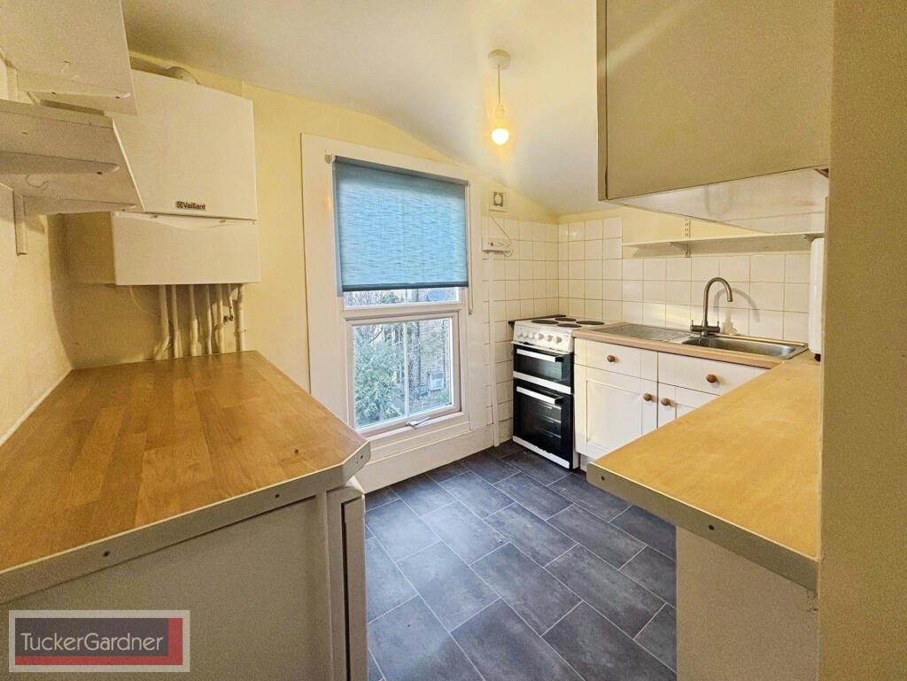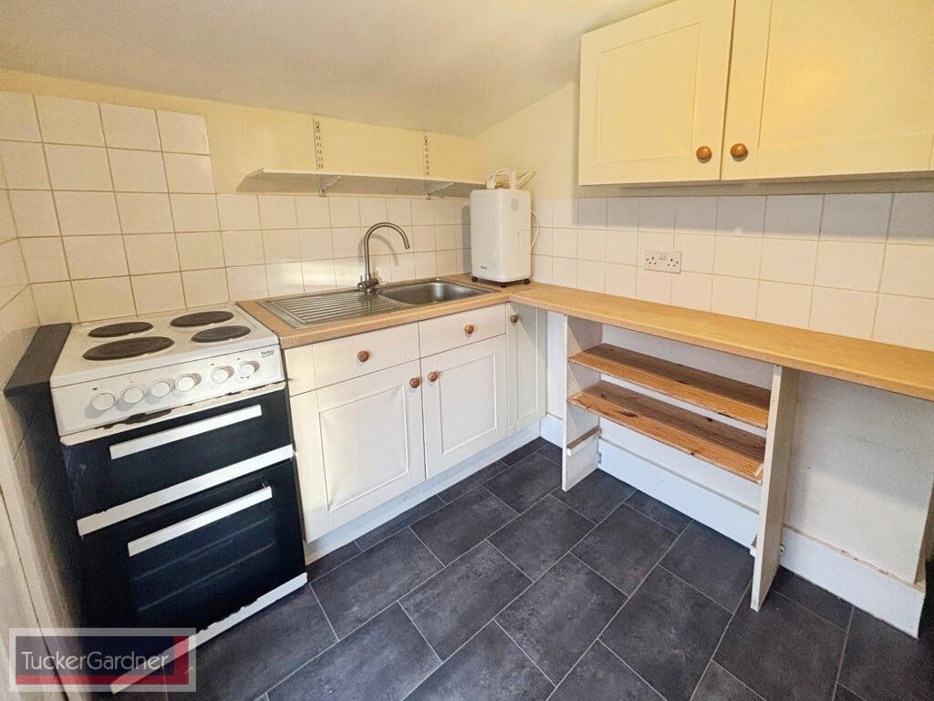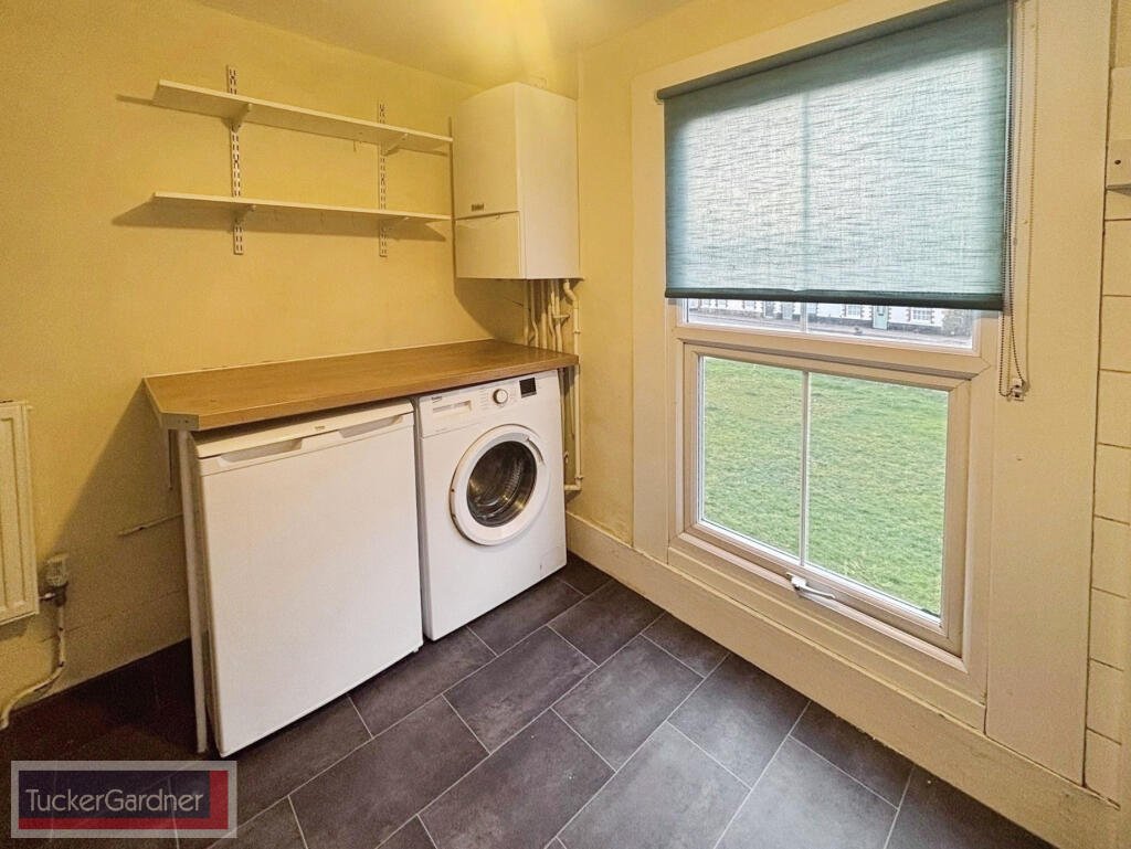 The kitchen has a built-in oven and space for a fridge-freezer and washer/dryer.