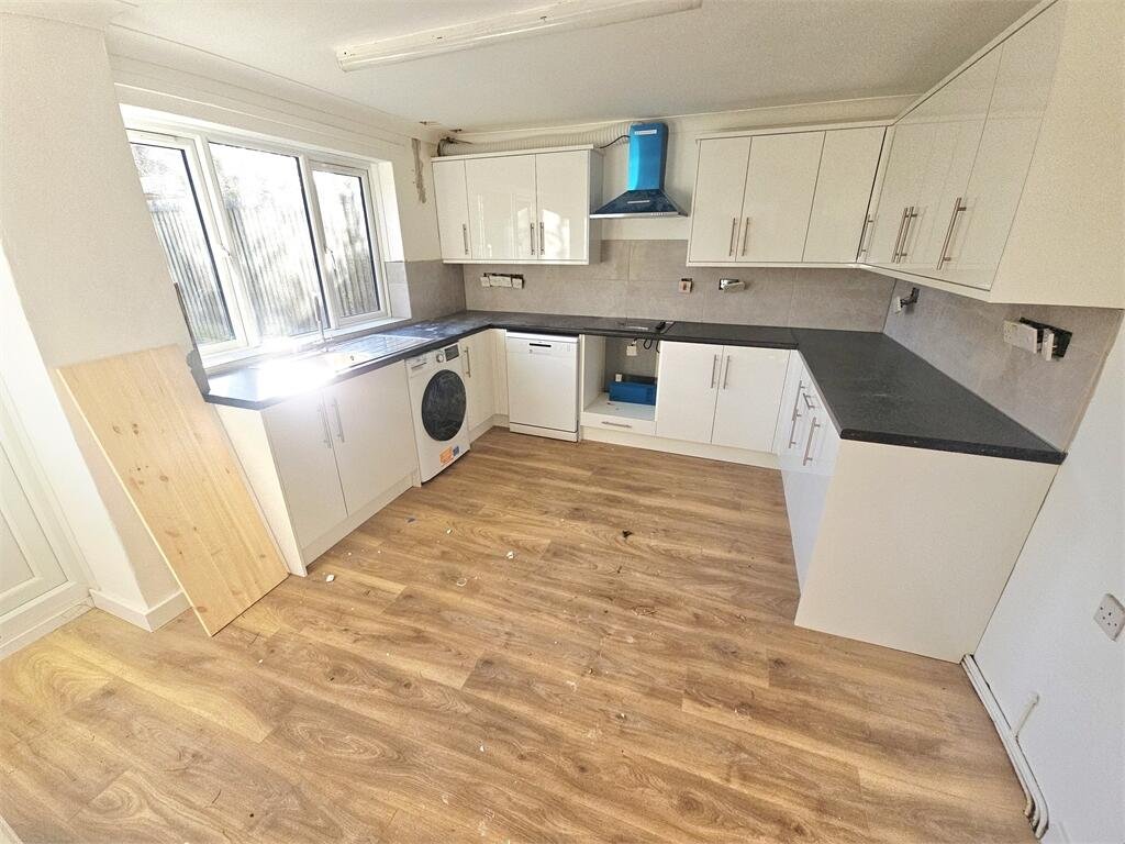 Kitchen (12′ by 10′ (3m 66cm by 3m 5cm), ())Smooth ceilings, White eye level and base level units, 4 ring ceramic hob with under oven and over extractor fan, laminated wood flooring, double glazed window to rear aspect and double glazed door to garden, power points, coving, roll top work surfaces incorporating a stainless steel sink with single drainer and mixer taps, space for washing machine and fridge freezer.