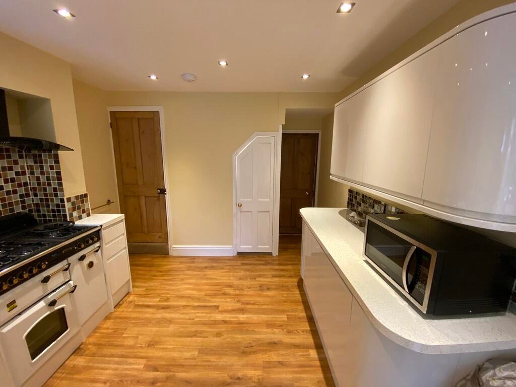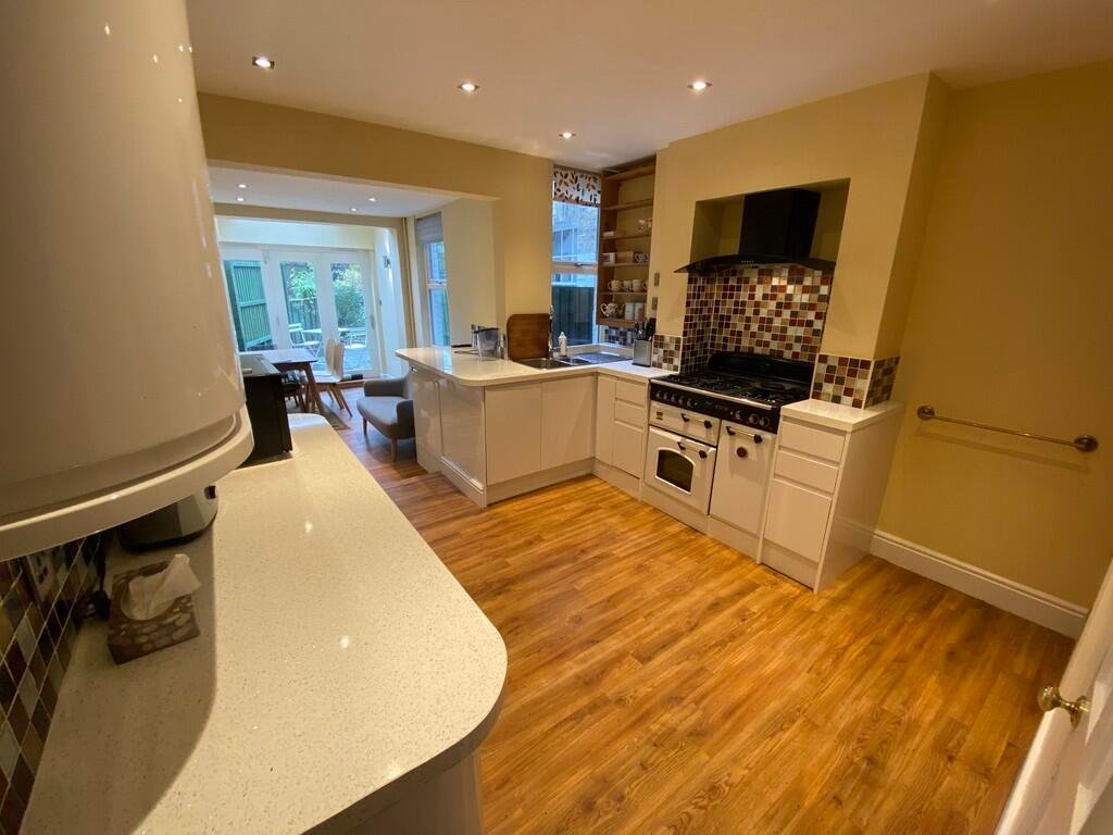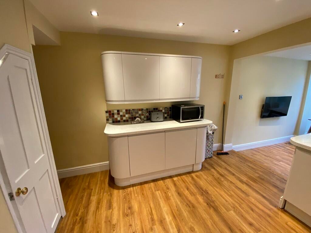 KITCHEN A luxuriously appointed kitchen with generous range of soft close handle less storage cupboards and drawers to base and eye level, working surfaces with attractive tiling to splashbacks and inset one and a half bowl single drainer sink unit with mixer tap, rounded storage cabinets, Leisure dual fuel cooking range, mosaic tiles to splashbacks, built-in and concealed automatic washing machine, built-in and concealed dishwasher, built-in and concealed refrigerator and freezer, microwave, kettle. Kitchen comes fully furnished with pots, pans, cutlery, crockery etc. Under-stairs cupboard.Â