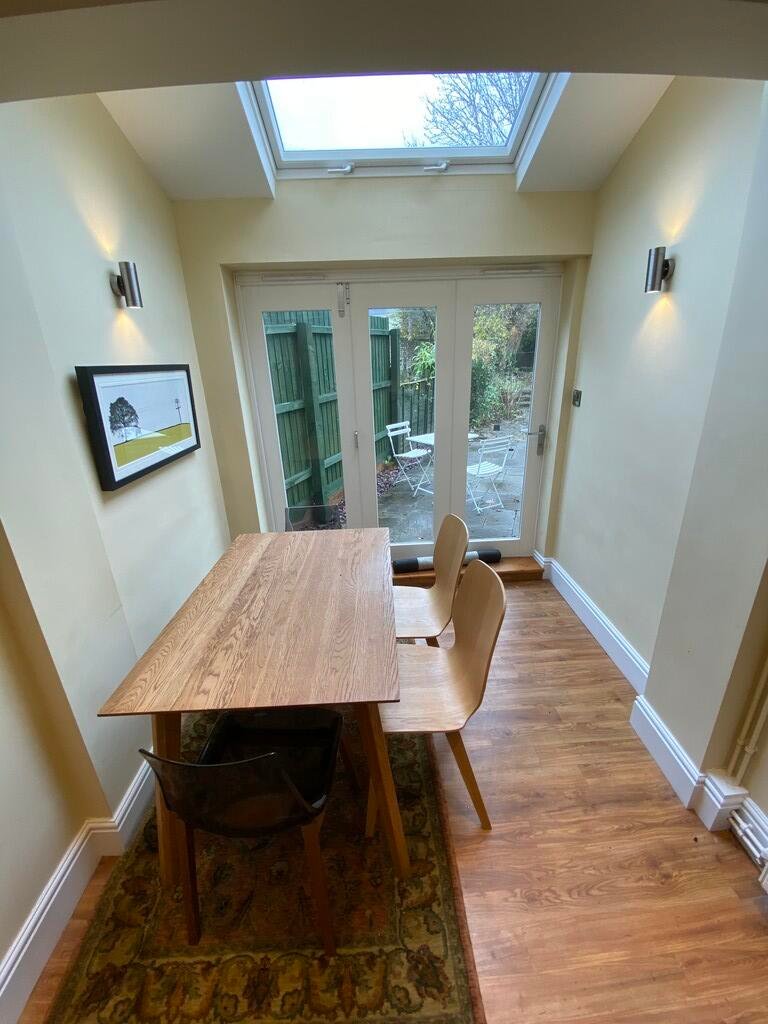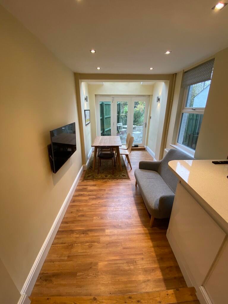 kitchen, with provision for wall mounted television, double panelled radiator, part vaulted ceiling with large double-glazed Velux rooflight, double glazed tri-fold doors to the rear leading out to the garden. Two-seater sofa, dining table and chairs.Â