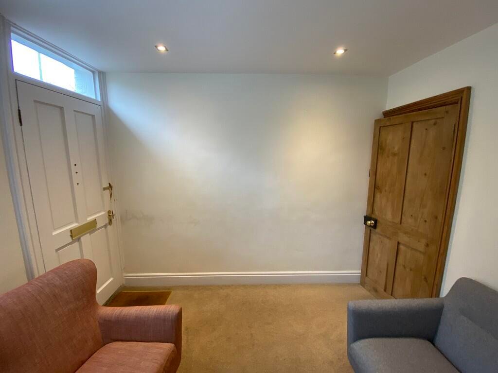 LIVING ROOM To the front, with feature exposed brickwork chimney breast with open fire and tiled hearth, double panelled radiator, double glazed sash window to the front, ceiling with a range of inset downlighters. Two-seater sofa with matching cushions. Two armchairs. Ladder shelving unit, coffee table, tv. Â