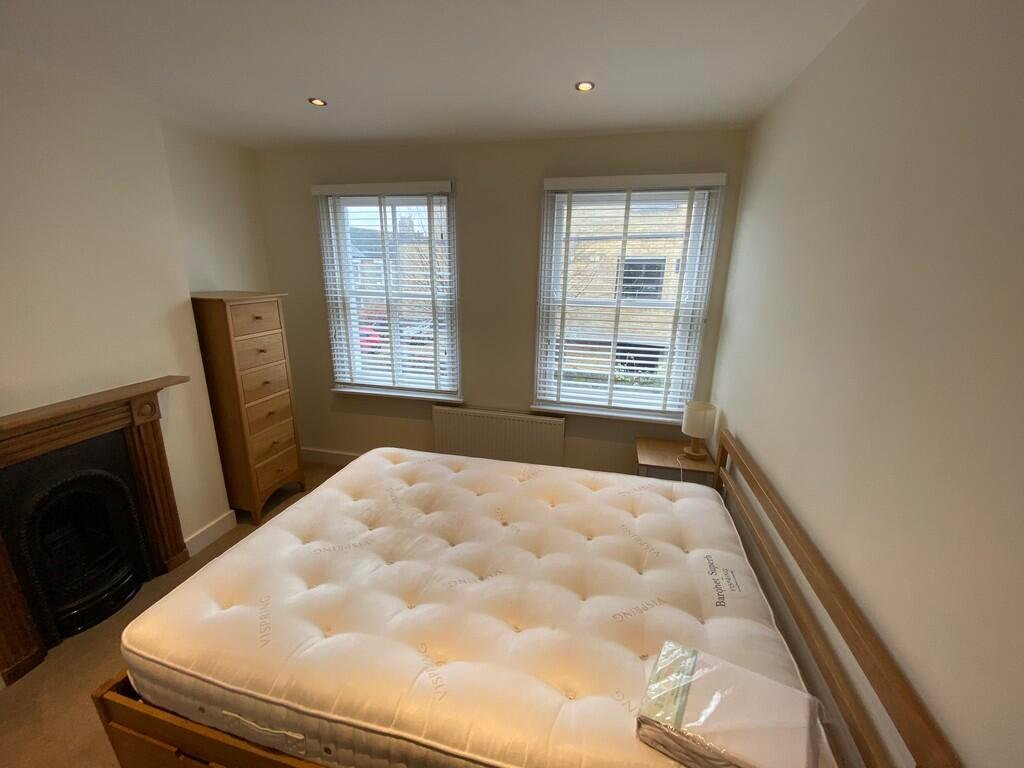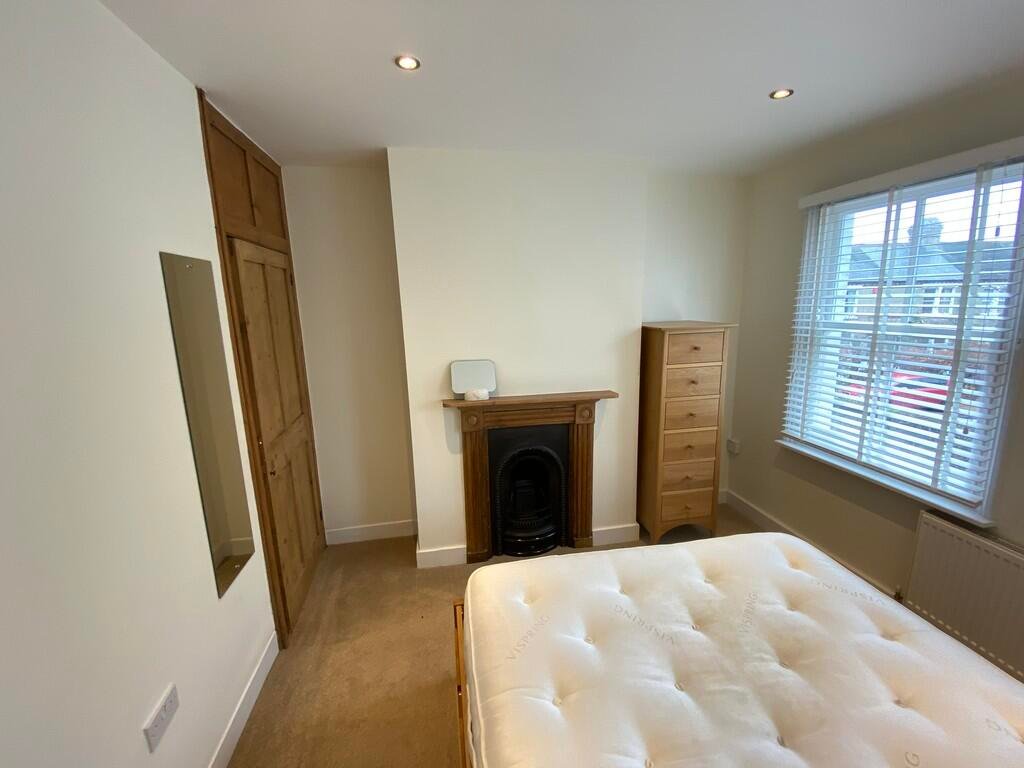 MASTER BEDROOM To the front, with cast iron fireplace with wooden mantel and surround (feature only), radiator, wardrobe cupboard, ceiling with inset downlighters, and a pair of double-glazed sash windows to the front with blinds. Bed frame and mattress, chest of drawers, bedside table, lamp.Â