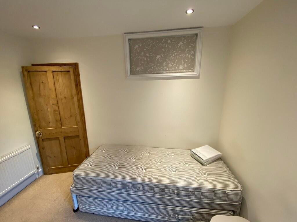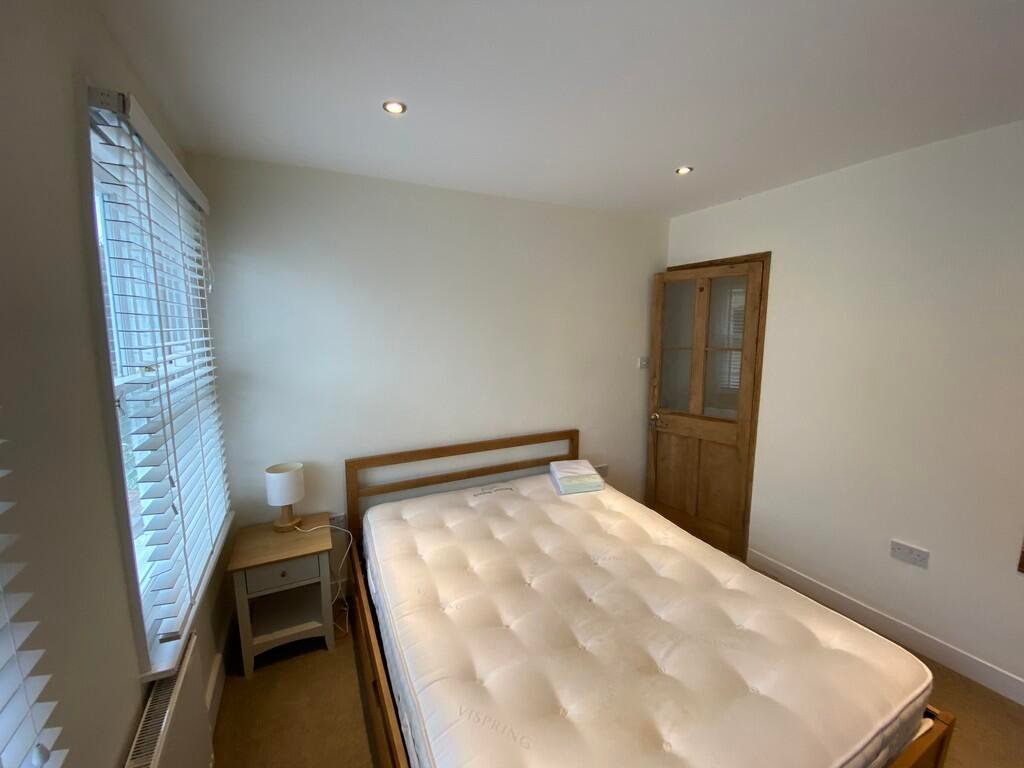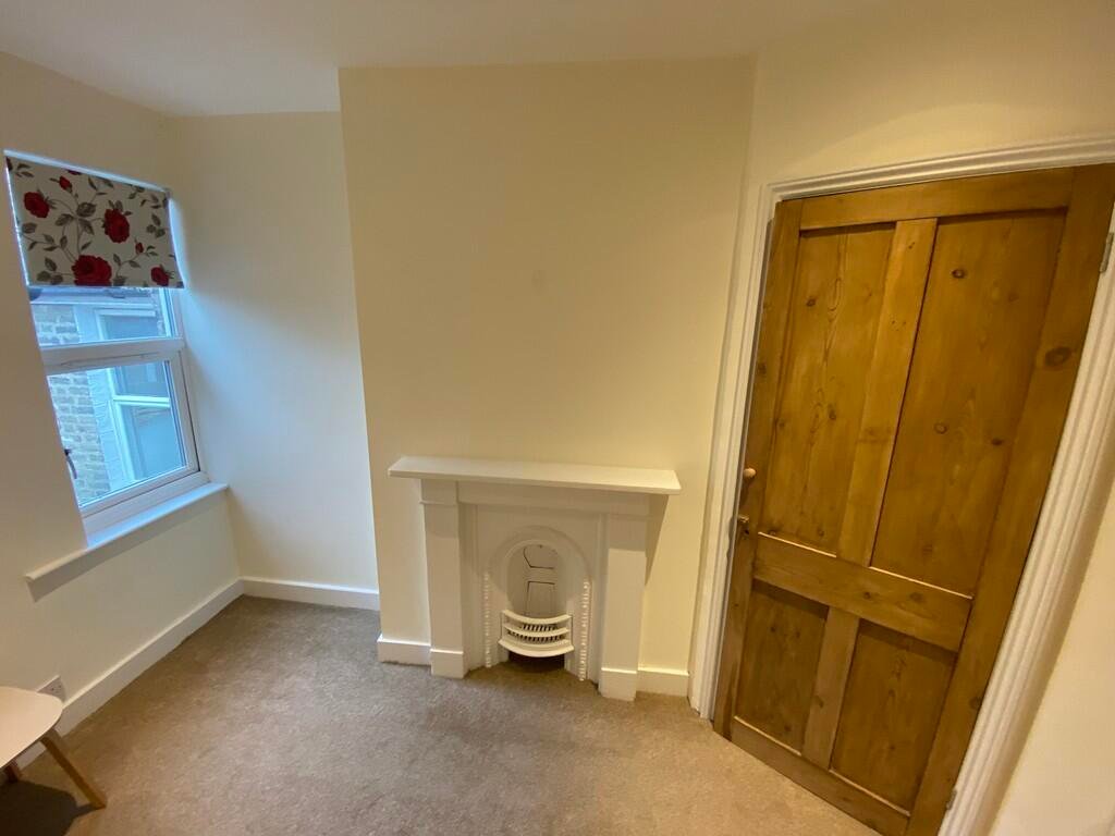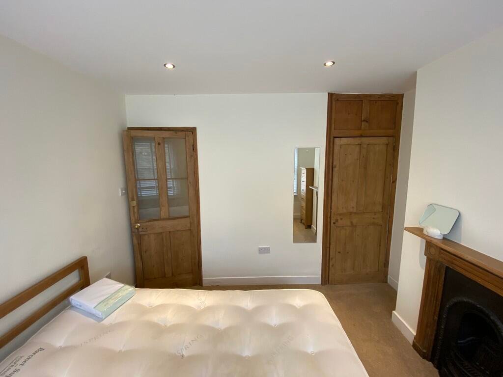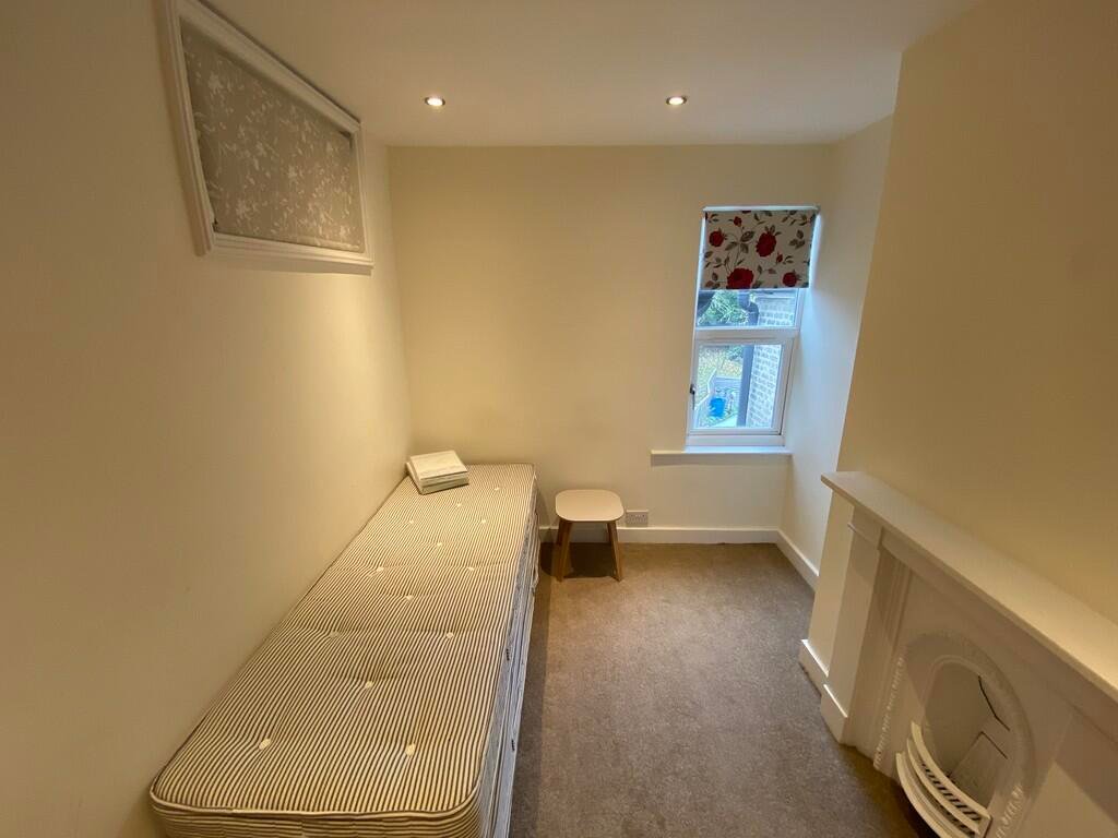 SECOND BEDROOM To the rear, good size fitted wardrobe cupboard, cast iron fireplace with mantel and surround (feature only), radiator, ceiling with inset downlighters, double glazed window with blind. Single bed and mattress, side tableÂ