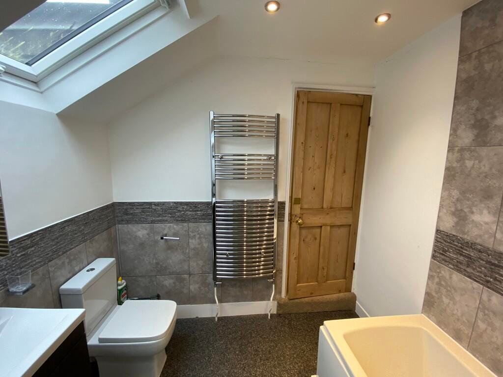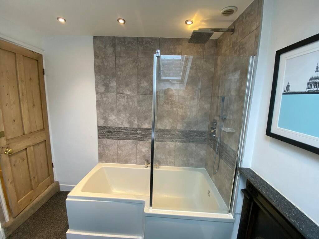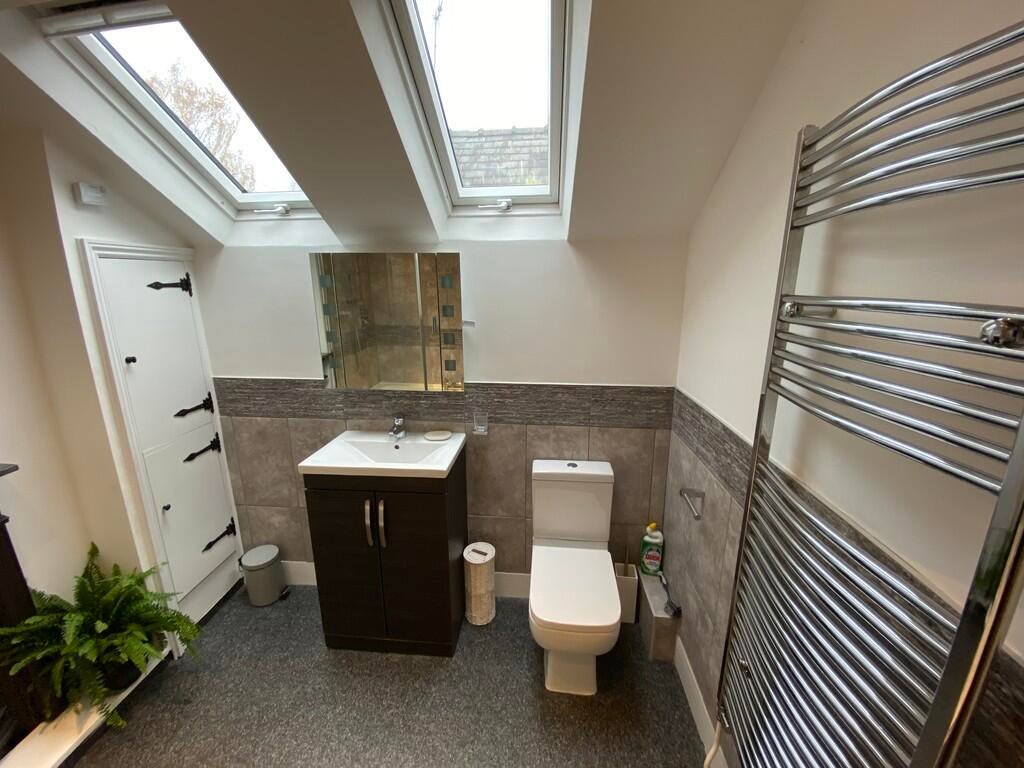 FAMILY BATHROOM With feature vaulted ceiling with inset downlighters, extractor fan, cast iron fireplace (feature only), bathroom has been refitted with panelled shower bath with mixer tap and separate shower controls with drencher shower head and hand held rose and glazed shower screen, wash hand basin with storage cupboard, mixer tap, low level dual flush w.c, heated towel rail/radiator, attractive tiling to part walls, cupboard housing Ideal Logic Combi gas fired boiler providing domestic hot water and central heating system, a pair of double glazed Velux rooflights and extractor fanÂ