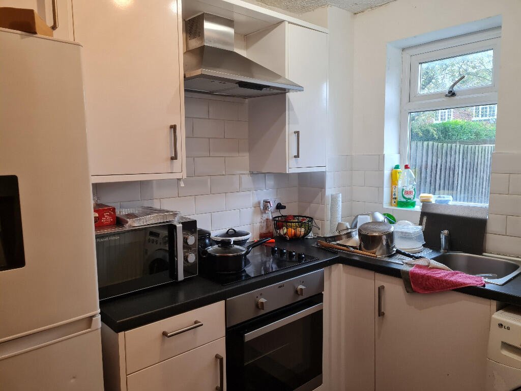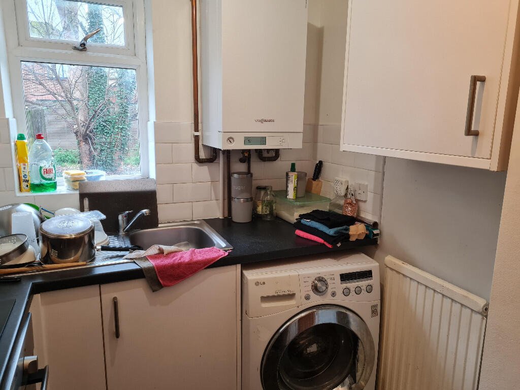 Kitchen: White gloss fitted kitchen with black marble effect laminate worktops. Electric oven and hob, extractor hood, stainless steel sink/drainer with chrome mixer tap. Space for fridge/freezer and washing machine. Boiler. Understair cupboard. White walls and black vinyl flooring.