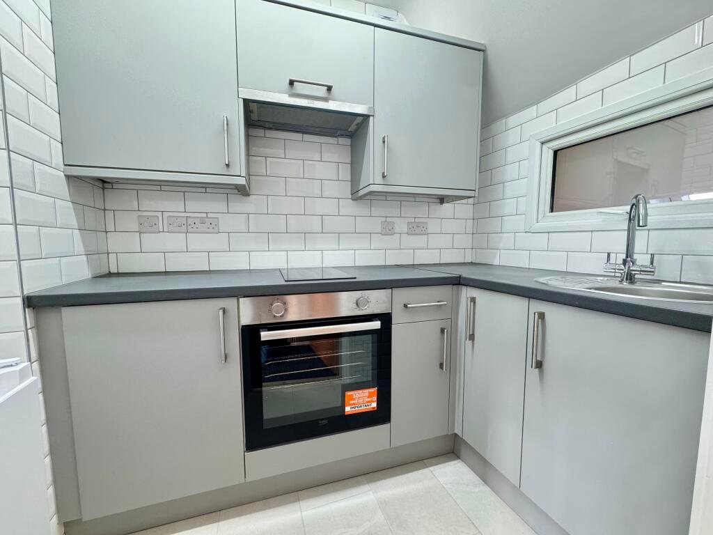 Kitchen:Features a selection of modern wall and base units, an integrated cooker with an extractor hood, electric hob, and a freestanding fridge freezer.