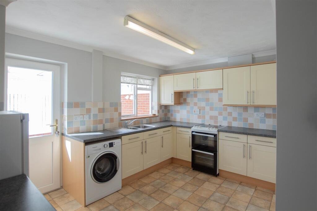 Kitchen – 4.06m x 2.67m (13’3″ x 8’9″) – Fitted wall and base units with work top over, freestanding electric cooker, space and plumbing for appliances, stainless steel 1 1/2 bowl sink with mixer tap and drainer, two storage cupboards, window to rear, door to: