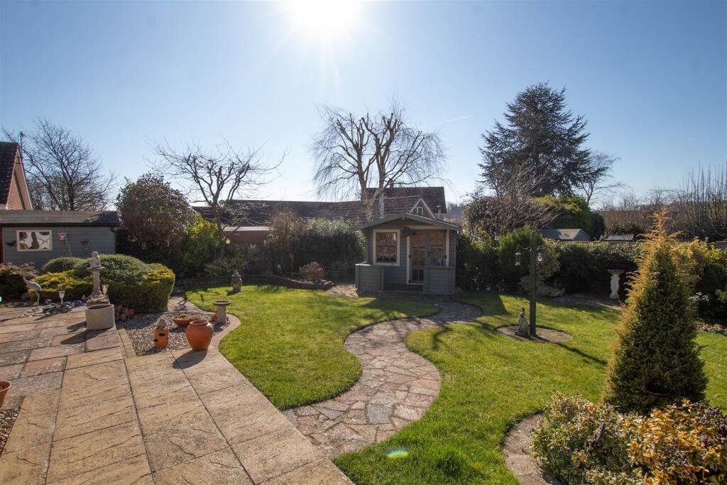 Garden – Landscaped rear garden providing patio seating areas and lawn surrounded by mature shrubs and bushes, pedestrian door to garage, gated side access, summerhouse