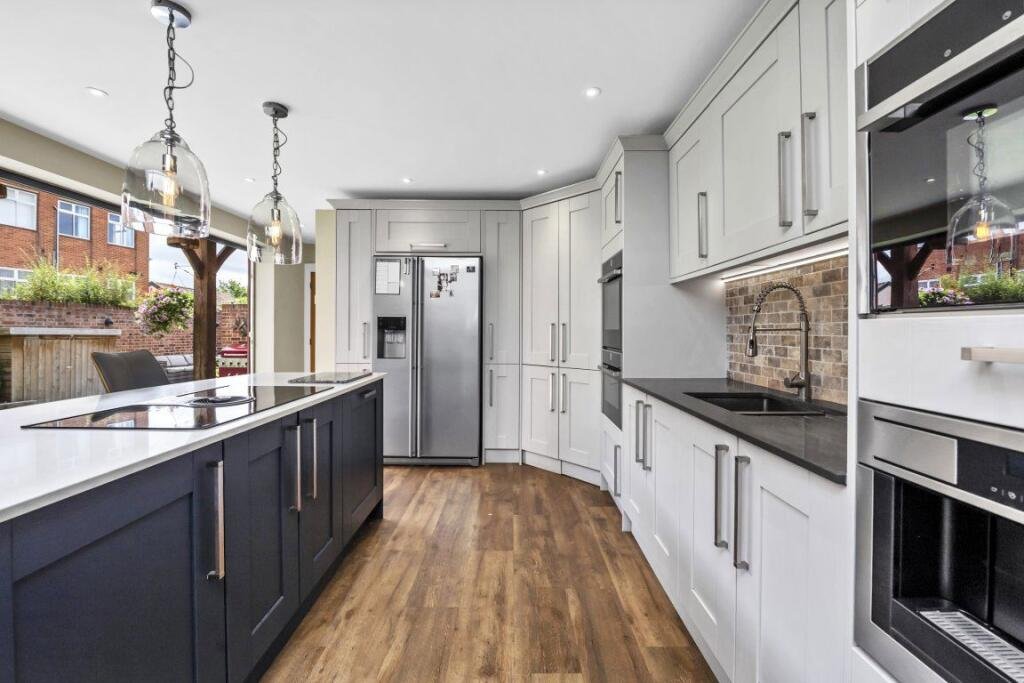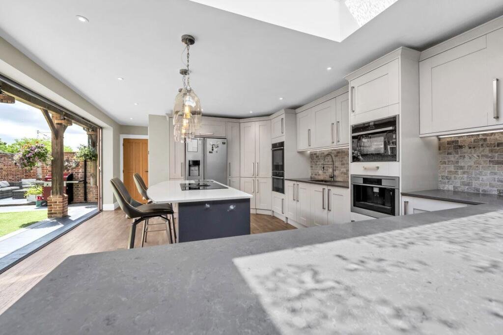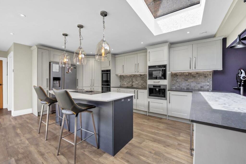 Kitchen 17ft9 x 14ft2 – Wooden flooring, fully fitted shaker style kitchen with range of wall and floor units and undercounter lighting, integrated appliances including double oven, steamer, coffee machine, wine fridge, dishwasher and space for American style fridge freezer. Composite stone effect worktops, with inset sink stone tiled effect splashback, kitchen island with large inset induction hob and designer lighting above. Large bifold doors and large glass ceiling letting in plenty of light.