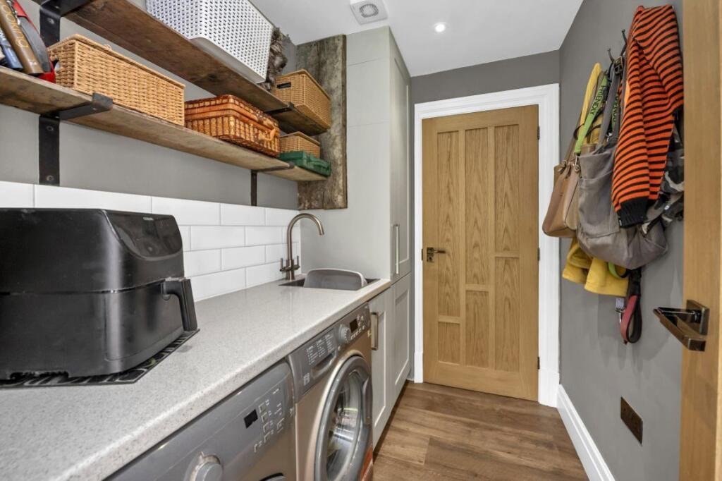 Utility room Wooden flooring, worktop with inset sink and washing machine, dryer and cupboard beneath with shelving above. Boiler cupboard and door to cloakroom.