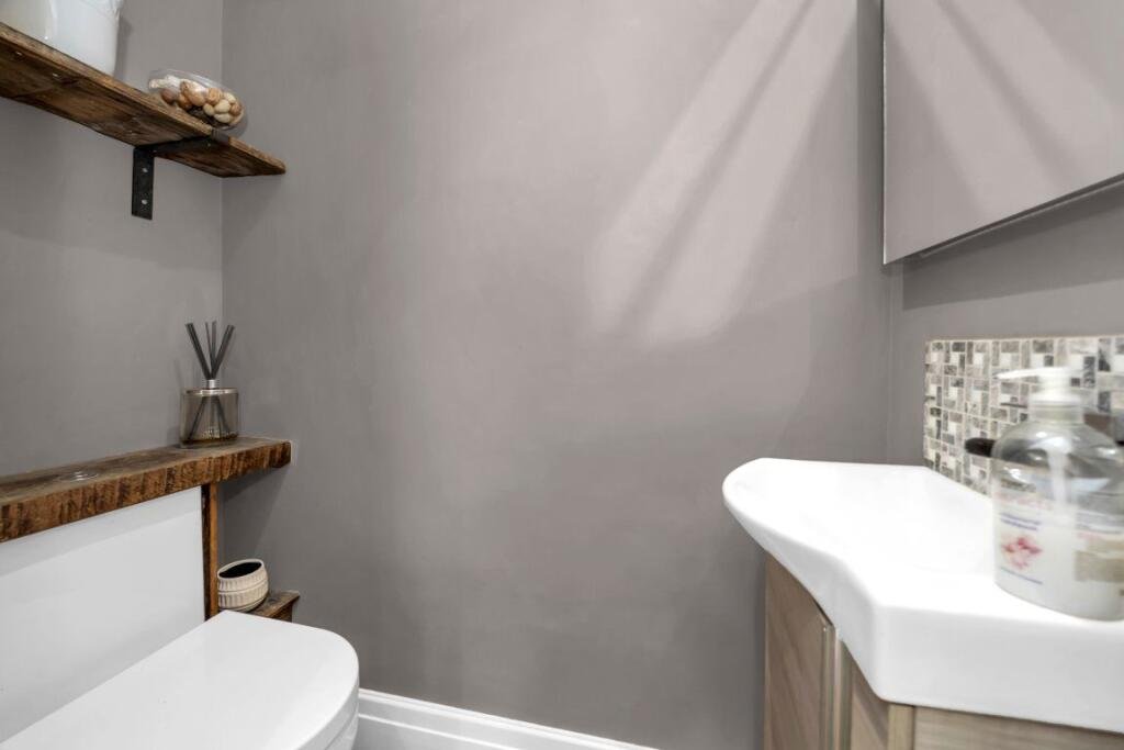 Downstairs Cloakroom Wooden flooring, modern white WC with shelving above, sink with vanity unit beneath, tiled splashback and mirror above.