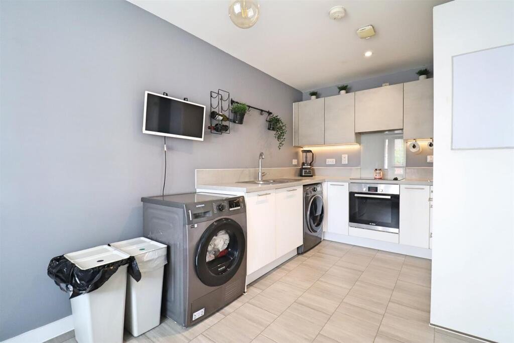 Kitchen /Diner – 4.93 x 2.53 (16’2″ x 8’3″) – Tiled flooring, high gloss wall & base units with edged work surfaces, one & a half stainless steel sink, integral oven, four ring hob, fridge/ freezer & dishwasher, space for washing machine, double glazed bay window to front, radiator.