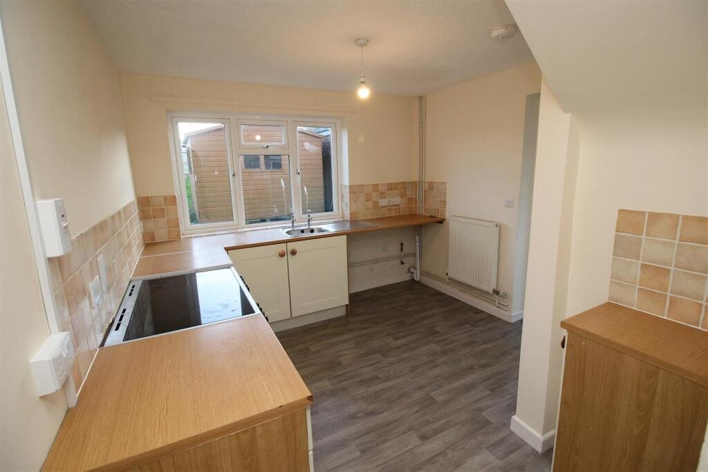 Kitchen – 3.53m m x 2.46m (11’7″ m x 8’1″) – With window to the rear elevation. Range of base units with wood effect work surface and stainless steel sink with drainer and tiled surround. Inset Leisure range cooker and space for washing machine and dishwasher. Large under-stair storage cupboard. Double panel radiator.