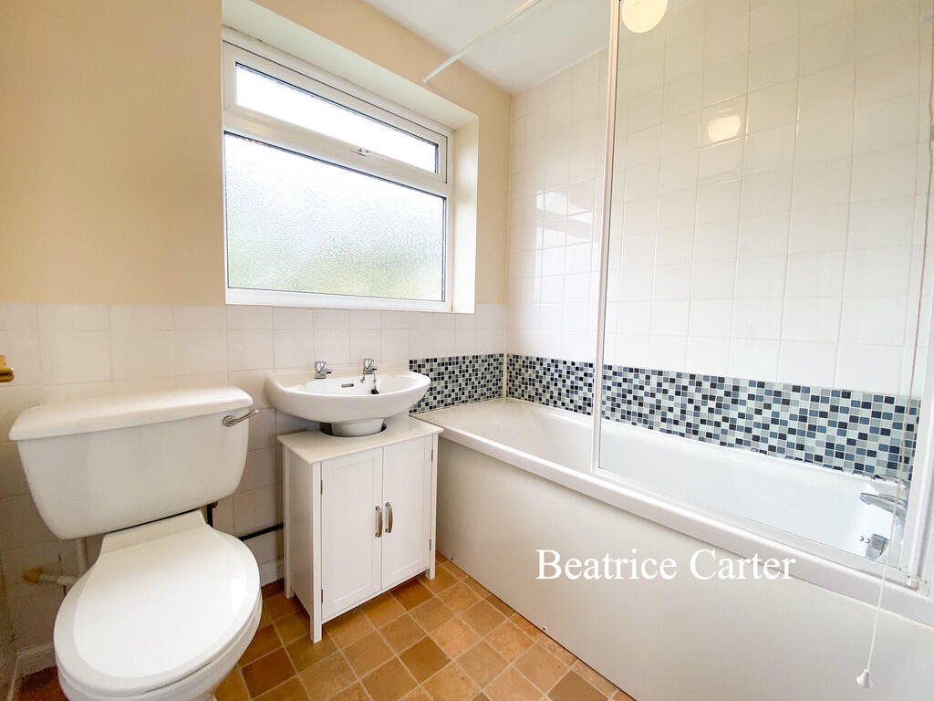 BATHROOM 6′ 7″ x 5′ 6″ (2.01m x 1.68m) Vinyl Flooring,Blind to Window,Bath with Shower Over,Hand Basin,Toilet.