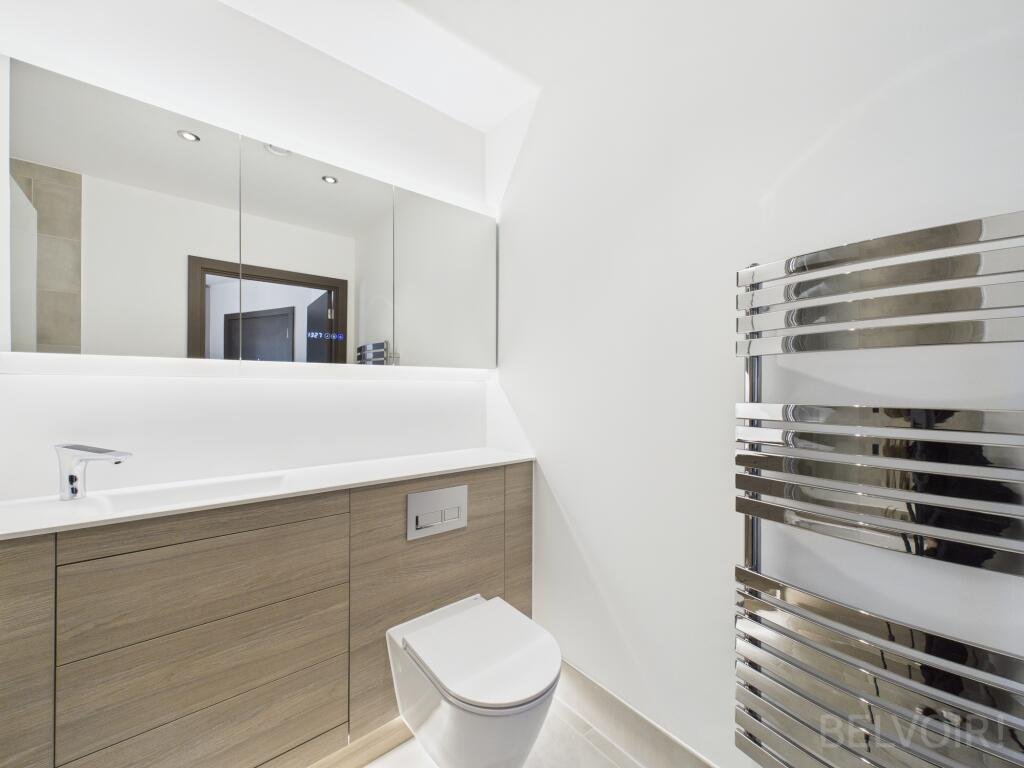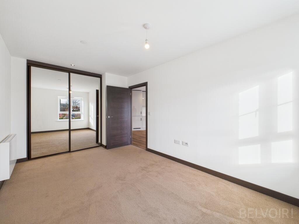 Both bedrooms are well-proportioned and filled with natural light. The main bedroom features fitted mirrored wardrobes, while the second bedroom benefits from dual-aspect windows, creating a bright and airy feel. The bathroom is finished to a high standard, complete with an overhead shower above the bath and contemporary fixtures throughout.