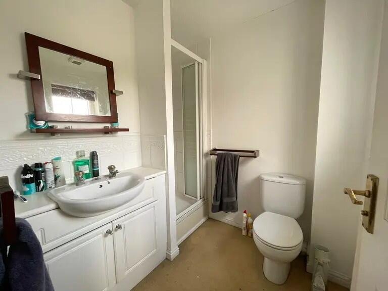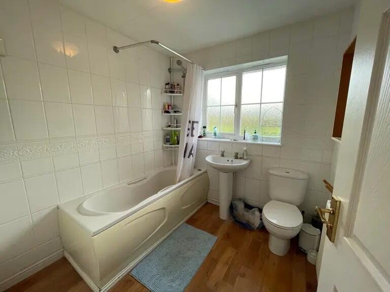 One bedroom offers an en suite washroom, and this is a main bathroom situated on the first floor that includes a three piece suite; toilet, hand wash basin, and shower over bath.