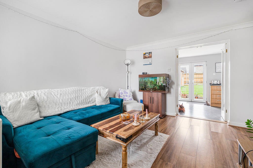 Living room With window to the front aspect, wood effect flooring, stairs to the first floor, under stairs storage cupboard, glazed double door to