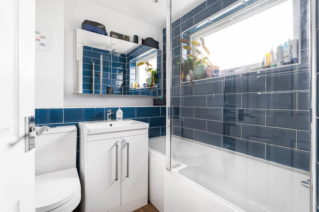 Family bathroom With window to the front aspect, contemporary suite comprising; low level wc with eco flush, vanity unit with inset basin and chrome mixer tap over and panelled bath with drencher head shower over, wood effect flooring, part tiled walls, chrome heated towel rail