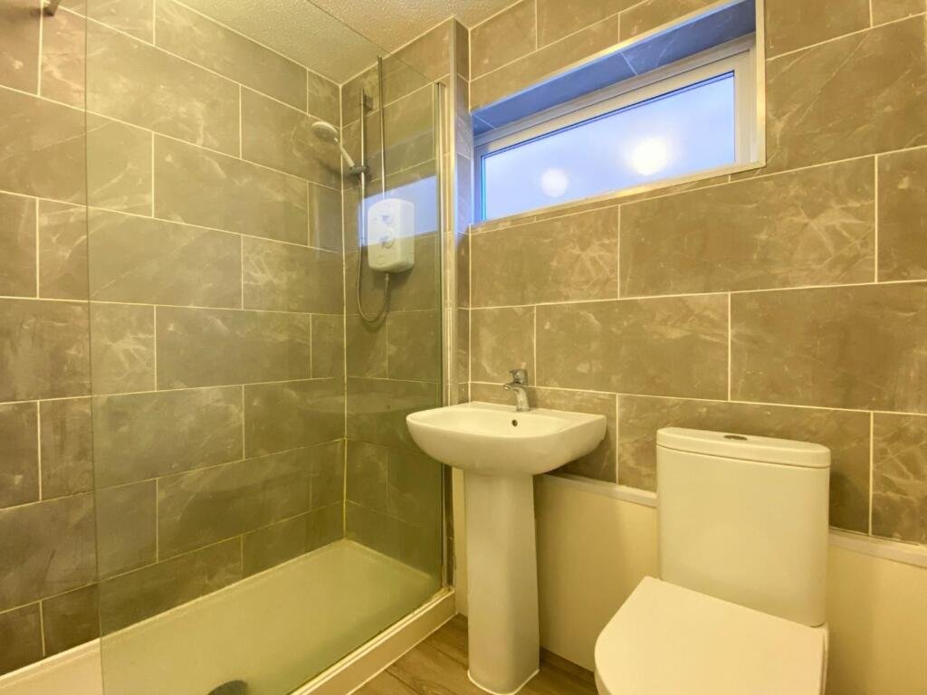 the first floor, the property has a double bedroom with a window to the front aspect and a fully tiled bathroom suite with walk-in shower, a pedestal sink unit and a low-level WC.