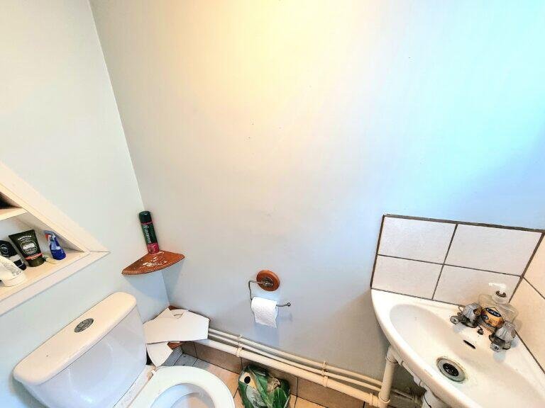 The bedroom is furnished with a bed, desk, chair and wardrobe. The property offers two modern bathrooms, one on each floor, both fitted with a toilet, sink and shower or bath. There is also a separate