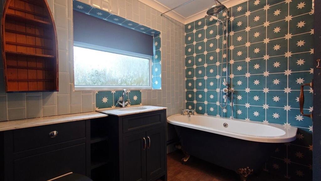 Bathroom Modern white bathroom suite including sink and WC with vanity unit beneath, freestanding bath with thermostatic mixer shower with soaker head above, tiled to walls and floor, large chrome towel rail, airing cupboard, window to rear with privacy glass.