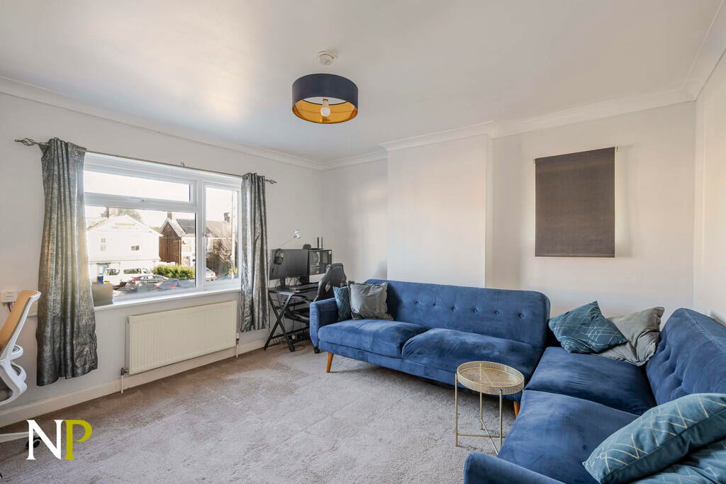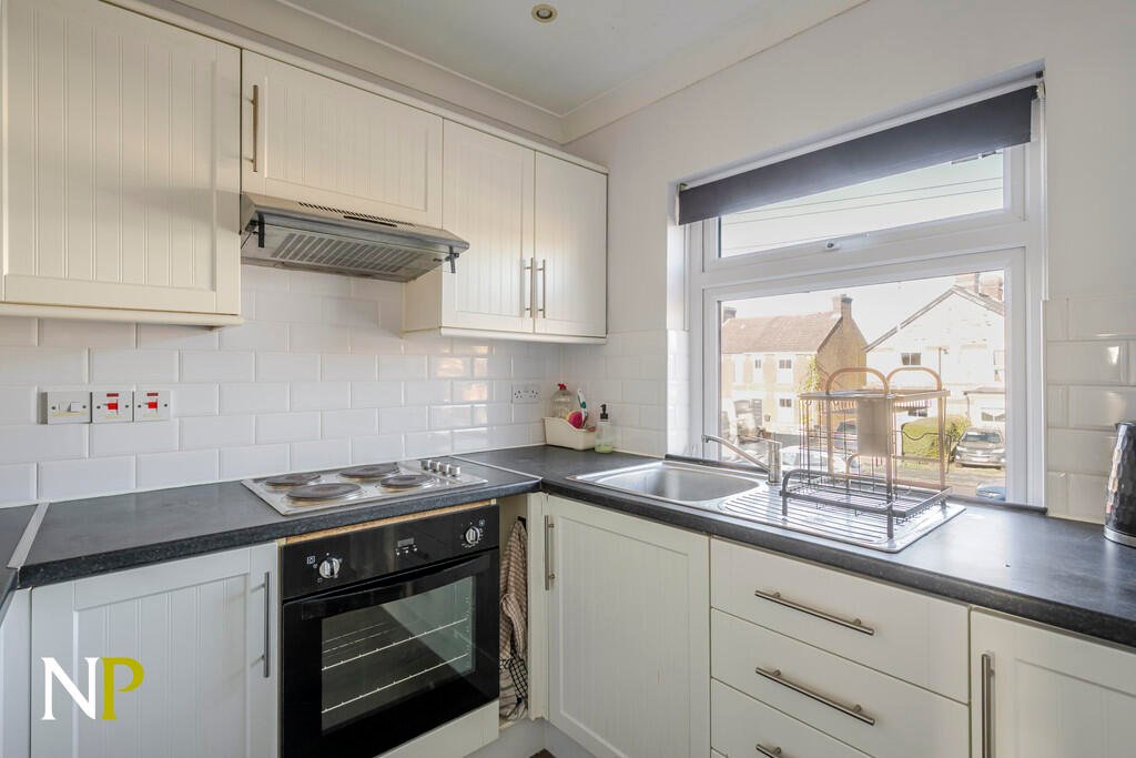 The kitchen is positioned at the front of the property and features white shaker-style units, a gas hob, electric oven, and space for a fridge freezer. The front-facing bedroom enjoys good natural light and provides a comfortable space for a double bed. To the rear, the living and dining room offers a well-proportioned area suitable for a variety of furnishings.