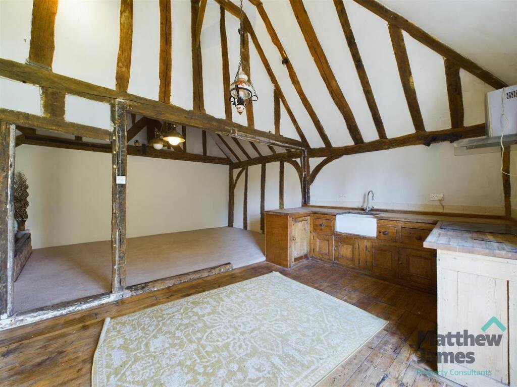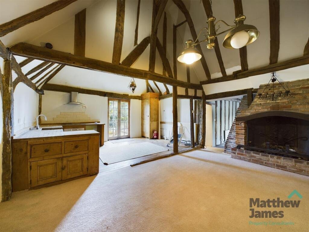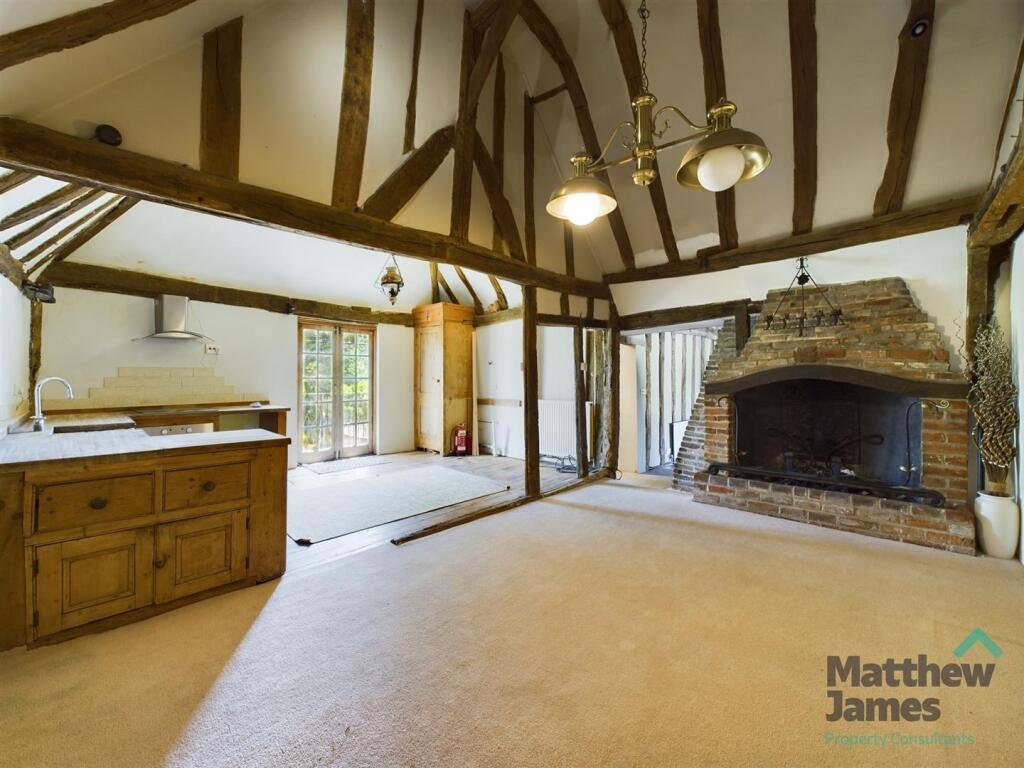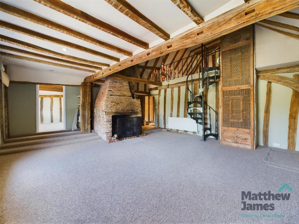 Living Room – 5.78 x 6.04 (18’11” x 19’9″) – A light room with two windows. Staircase leading to mezzanine bedroom. Brick fireplace with oak beam.