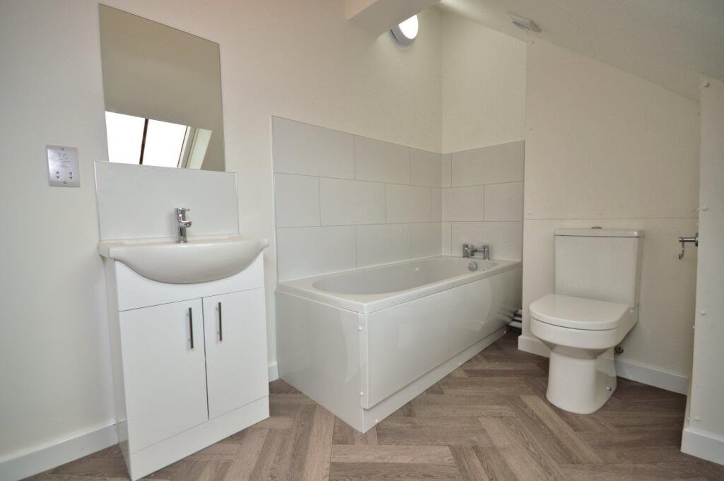 The bathroom within the apartment features a bath, wash basin, WC and a heated towel rail.