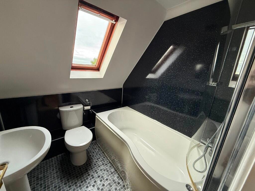white suite comprising panelled bath with shower over, hand basin, wc, towel radiator, Velux window..
