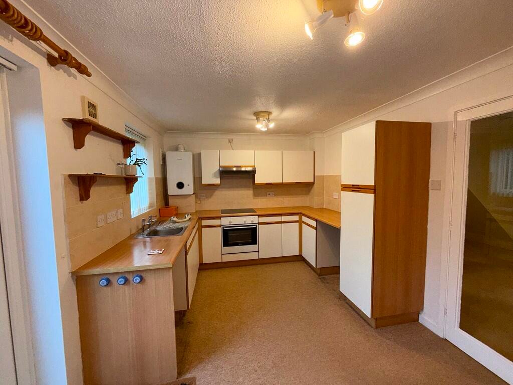 fitted with a range of base and wall units, electric oven, hob with extractor over, gas boiler, pluming for washing machine, radiator, patio doors to rear garden.